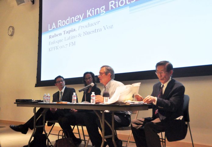 Jin Ho Lee of Radio Korea, Karen Slade of KJLH radio and Ruben Tapia of Radio Bilingue, representing the Korean, African-American, and Latino communities, offered an up-close alternative to the mainstream media’s perspective on the riots.