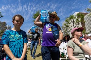 A crowd of about 36,000 people filled the park surrounding the small stages, spilling out onto the steps of Los Angeles City Hall. The park was standing room only, with event volunteers directing foot traffic and providing free water for those struggling in the heat, reaching the mid-80s.