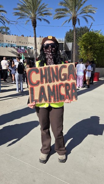 Entre la multitud destacaban pancartas con mensajes contundentes como “Orgullosa hija de inmigrantes”, “Financiamiento a la educación, NO a la deportación” y otras más explícitas, como “Chinga la Migra”, que reflejaban el hartazgo y la rabia acumulada frente a las redadas y la violencia sistemática. Los colores, las voces y los carteles transformaron el espacio universitario en un escenario de resistencia y denuncia.