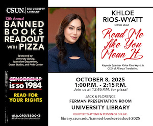 The University Library, Department of Journalism, Pride Center, and Queer Studies Program will host the 13th Annual Banned Books Readout “Censorship Is So 1984 — Read for Your Rights!” on Wednesday, October 8, 2025 from 12:45 p.m. to 2:15 p.m. at the Jack & Florence Ferman Presentation Room, University Library. CSUN Professor of Journalism Elizabeth Blakey will provide remarks and her Journalism 100 Intro to Mass Communication class will read out loud from selected books that have been censored or challenged, including books from the top ten list of censored books from 2024. RSVP required through the University Library website HERE.
