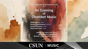 The CSUN Department of Music continues its ChamberMusic@CSUN series with an action packed program featuring world-renowned chamber musicians Misha Quint, cello, and Hong-Mei Xiao, viola, who are joined by our CSUN faculty musicians Dmitry Rachmanov, piano, and Lorenz Gamma, violin.