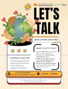 Hi friends! We will be offering Let’s Talk with UCS’, Josh Chow starting September 10th, 9/10/2025! It occurs every Wednesday, 2:15 PM-3:45 PM. We hope to create a welcoming space for all where community and healing is embraced.