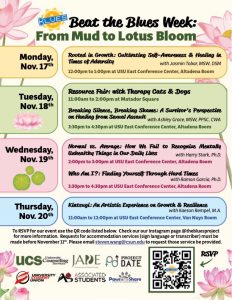 Come Join Us!! Beat The Blues Week Fall 2025. From Mud, Lotus Bloom– Your struggles turning into strengths. As professors present about unique and educational topics of Mental Health. #PeerEducators #MentalHealthAwareness.