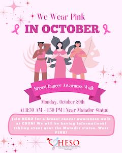 Join the Health Association Student Org Monday, Oct. 20 from 11:30 AM–1:30 PM by the Matador Statue for our Breast Cancer Awareness Walk!