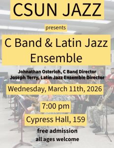 Next Wednesday, March 11th! Come to Cypress Hall 159 7pm for C Band and Latin Jazz Ensemble mid-semester concert!! Free admission and all ages welcome.