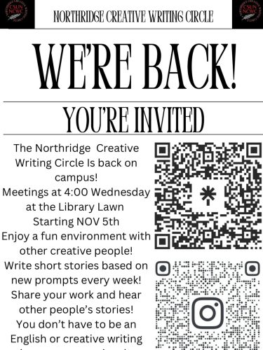 CSUN’s Northridge Creative Writing Circle is having it’s first meeting on this Wednesday, Nov 5th, on the University Library Lawn @4 pm. Come write with us!