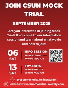 Are you interested in joining CSUN’s Mock Trial team? Attend their info session to learn how to join. @csunmocktrial is hosting try-outs in Bookstein Hall room 1133 at 10:30 AM on Saturday, September 13th.