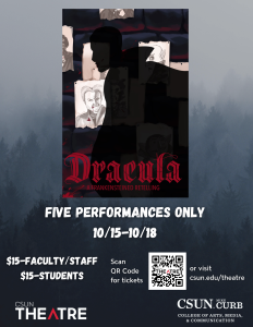 Written, devised, and staged by CSUN students and faculty, this “Frankensteined” retelling of Bram Stoker’s novel includes intentionally stitched-together and sometimes divergent literary and dramatic styles, periods, and contexts to theatricalize familiar and unexpected aspects of this gothic tale!