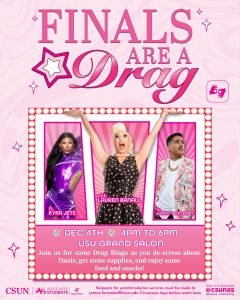 Finals season is quickly approaching and we know it can be stressful, so join us at Finals Are a DRAG on Thursday, December 4th from 4-6pm. Come destress and play Drag Bingo at the USU Grand Salon!