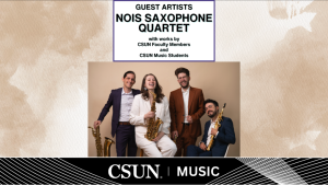 ~Nois will present an exciting evening of contemporary music for saxophone quartet featuring music composed by CSUN composition students and faculty paired with works by composers Bobby Ge and Shelley Washington. This recital is the culmination of a collaboration between CSUN Music and ~Nois that began in Fall of 2024. From snarling multiphonics to the lush sounds of the pipe organ, no two pieces on this concert are the same, ensuring an engaging and entertaining listening experience for the audience.