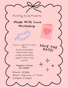 Made With Love Workshop Enjoy a night of crafty fun!!Come and make Valentine’s Day cards, bracelets, paper stars and more!! Supplies will be provided!! SAVE THE DATE!