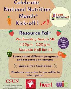 Hello Matadors! Ready to celebrate National Nutrition Month with us? Come to the National Nutrition Month Kick-off event on Wednesday March 5th in Sequoia Hall Room 112. We’re teaming up with different organizations and programs to bring you a Food Resource Fair! We will provide budget-friendly recipes, free food samples, and information about these different programs on campus.