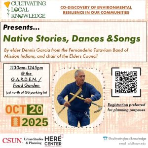 Join us on Monday, October 20 from 11:30a.m. to 12:45 p.m. for the “Native Stories, Dances, and Songs” event led by elder Dennis Garcia from the Fernandeño Tataviam Band of Mission Indians, and Chair of the elders council.