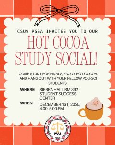 Come enjoy some hot chocolate, study for finals, and hang out with your fellow poli-sci students!