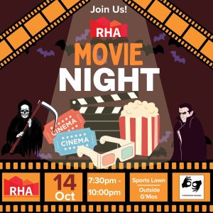 Hey Ghouls and Gals! RHA will be hosting a spooktacular MOVIE NIGHT next Tuesday, Oct 14th, right outside G’Mos. There will be popcorn, activities, screams, and treats! RHA hopes to see you there NEXT TUESDAY from 7:30 pm – 10:00 pm