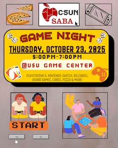 Hello All! We will be having a game night on Thursday, October 23rd from 5-7pm. This is the perfect time to come meet other members and socialize. We will have pizza, drinks, a raffle, and some SABA swag. Everyone is welcome. Hope to see you there!