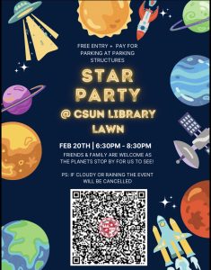 The Society of Physics students is collabing with the Physics and Astronomy Department for a night watching the stars! Multiple telescopes will be laid out in the campus lawn where people are going to be able to see celestial objects in the sky. Friends and family are welcome to attend.