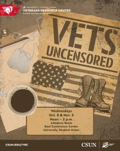 CSUN veterans, reservists and National Guard members! Come share your experiences, engage in meaningful conversations and build community at Vet Uncensored.