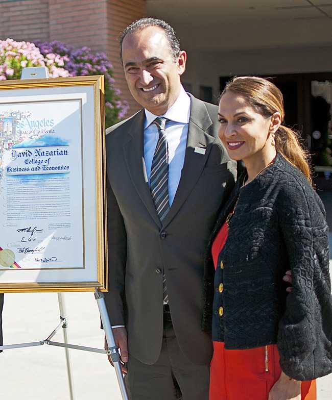David Nazarian, left, with his wife Angella Nazarian, right, has donated $10 million to the College of Business and Economics which CSUN has now named the college in dedication for his generous support at the naming ceremony on Thursday, March 27, 2014 in Cleary Court in front of Juniper Hall in Northridge, Calif. (Photo Credit: David J. Hawkins/PhotoEditor)