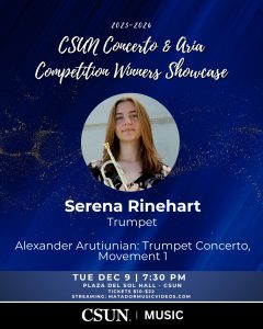 Plaza Del Sol Performance HallVocal Jazz Ensemble, Latin Jazz Ensemble and CSUN Jazz C Band THU DECEMBER 4 at 7:30 pm Plaza Del Sol, $10 – $22 Three groups in one night! The CSUN Jazz Vocal Jazz Ensemble directed by Kaitlin Pi, Latin Jazz Ensemble directed by Joseph Terry, and C Band directed by Johnathan Osterloh and assisted by Koosha...